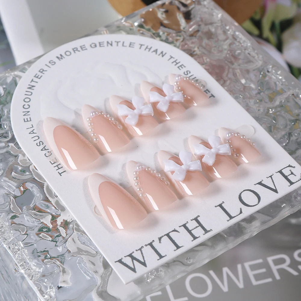 24pc Sweet Bow Knot Elegant French Press on Nails Long pink Almond Pearl Bow Fake Nails Full Cover Wearable False Nail for Girl